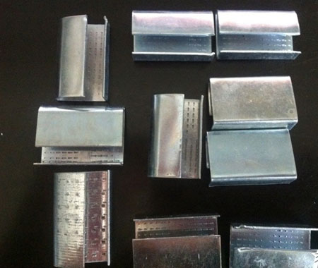 钢扣内侧有密麻小齿,起到防滑作用,每个打包扣其正常每个长度为30mm,宽度和厚度根据不同规格不一。现打包扣有两种材质,一种是镀锌板,一种是冷扎板电镀后或不电镀直接冲制而成。正常电镀我们通常选择的是银白色和金色两种,电镀后的钢扣的成本约比不电镀的高出1200元/吨的成本,但防生绣能力要强很多。相对来说镀锌板材质的钢扣硬度要高一些,不可用pp带或铁皮打包带的打包扣来代替塑钢打包扣(否则出现的效果是打不紧,容易脱落)。